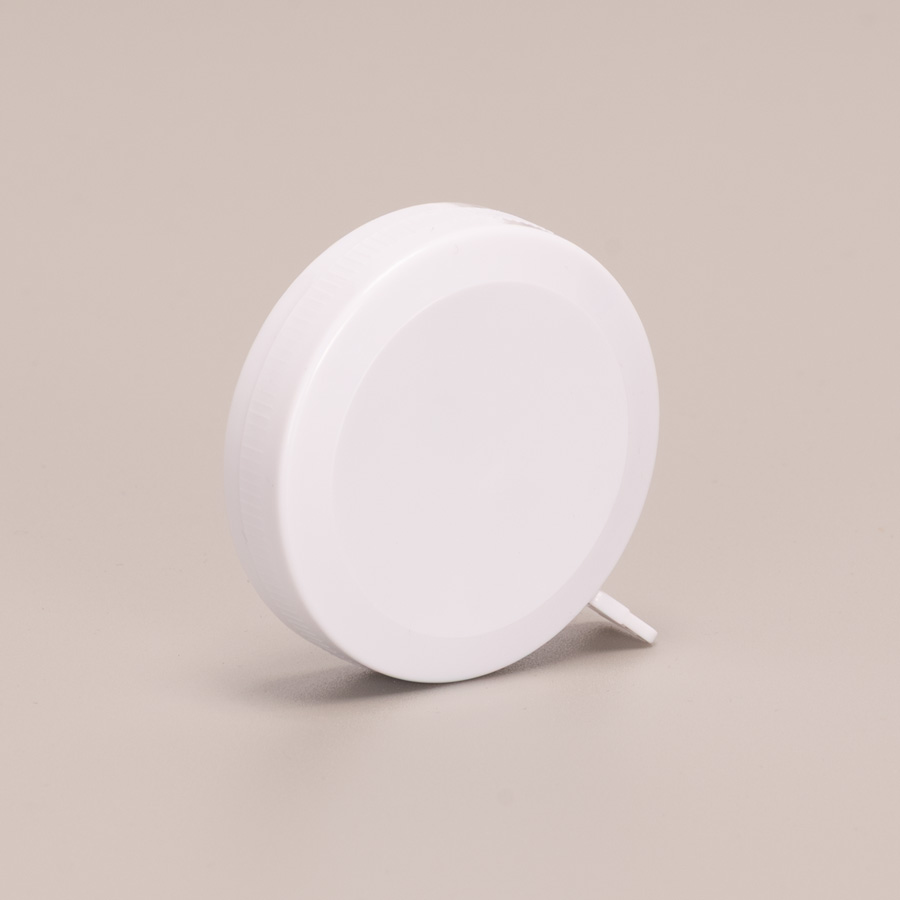 Cinta huincha de medir costurera retráctil flexible 1.5m, cuerpo de plástico ABS, huincha de 1.5m de largo (60 pulgadas por el reverso) de PVC flexible. Presentación en bolsita de PP transparente + caja de cartyón blanco.