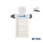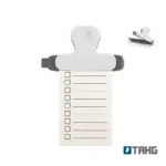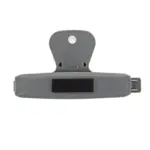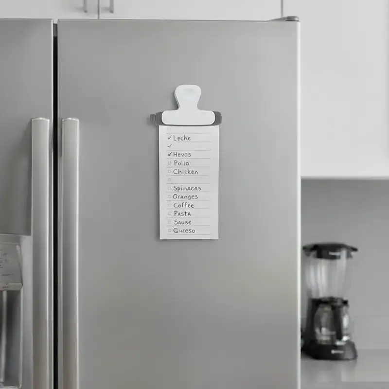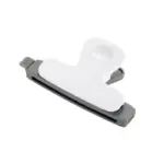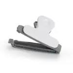 Clip magnético blanco y gris. Hecho de poliestireno y magneto. Cuenta con diseño ergonómico con imán trasero, pinza de agarre firme y superficie plana con detalles en gris. Es ideal para sujetar papeles, cerrar bolsas o adherirse al refrigerador para dejar recordatorios o notas.