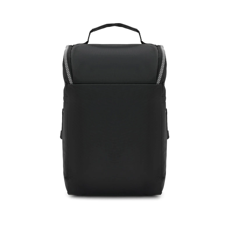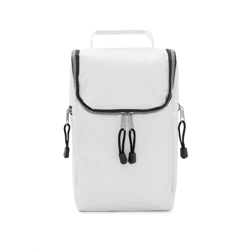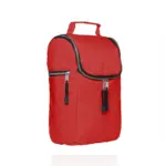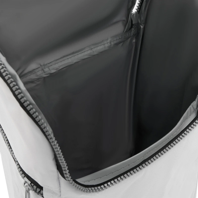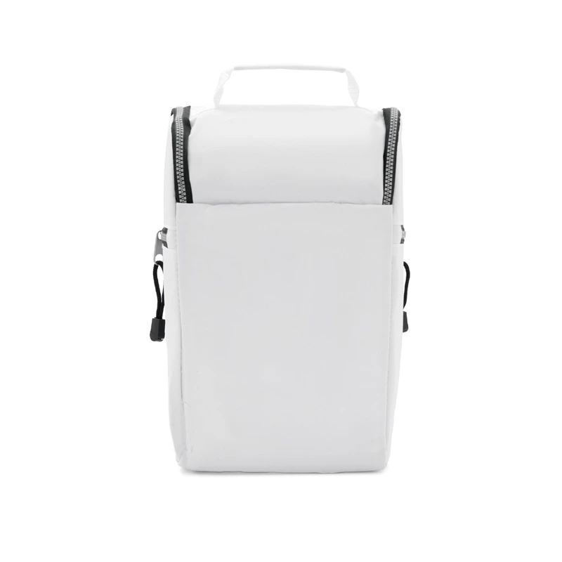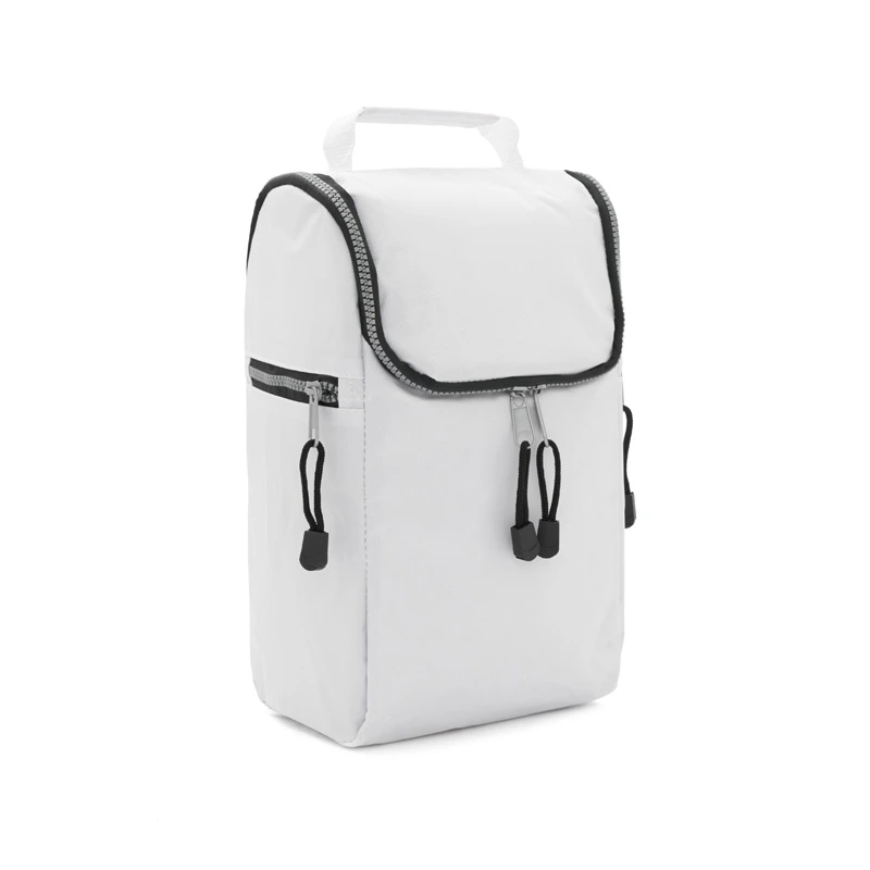 Cooler confeccionado en tela Nylon 600D, interior térmico forrado en PVC gris. Bolsillos laterales. Apto para llevar botellas, termos y otros.