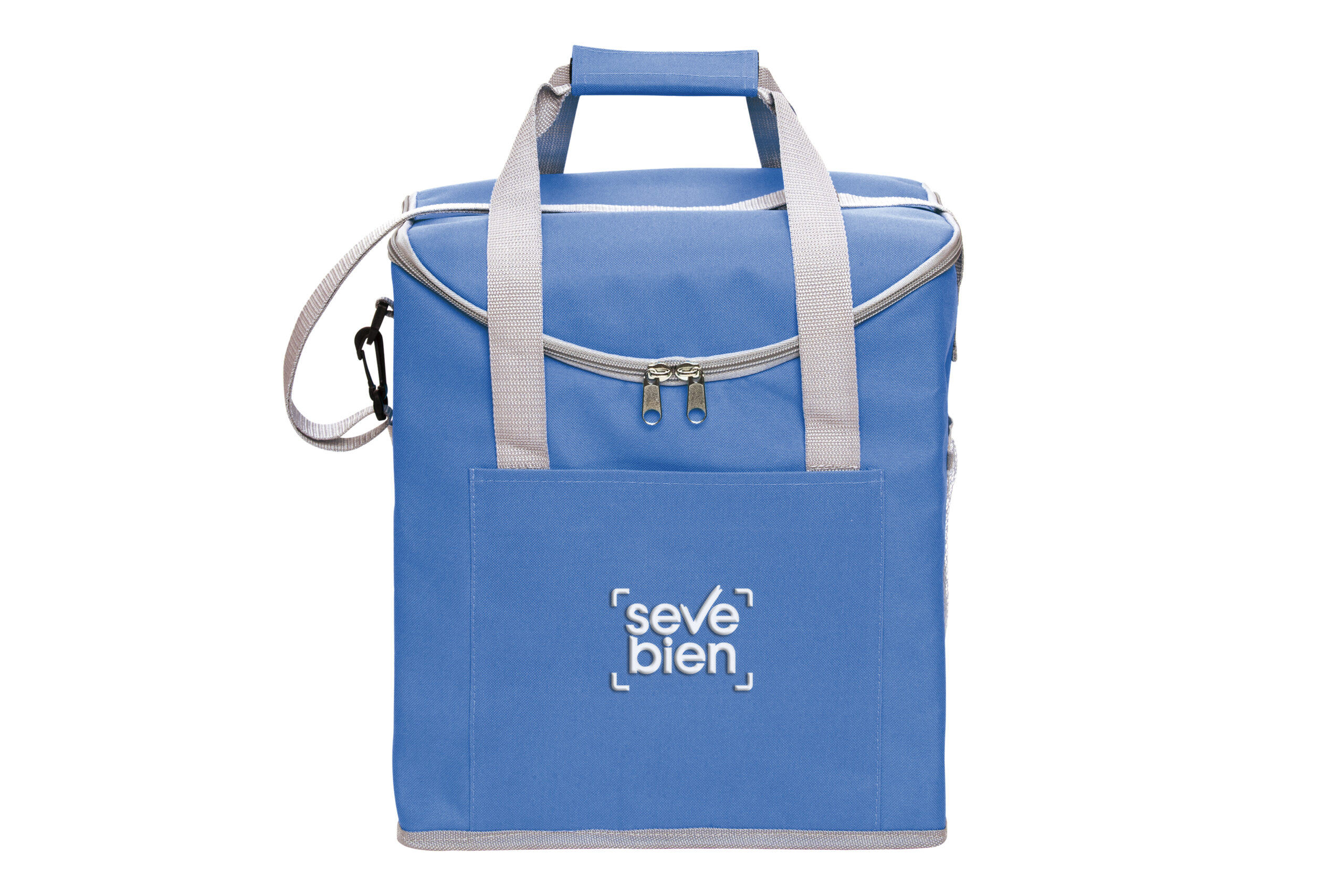 30 x 34 x 19,5 cm. Capacidad 37 litros. Poliéster. 600D Lonchera térmica con recubrimiento interior metalizado. Un bolsillo frontal y dos bolsillos laterales de red. Correa tipo bandolera y dos manijas reforzadas con cierre de velcro. Capacidad hasta 6 botellas de 2,5 litros