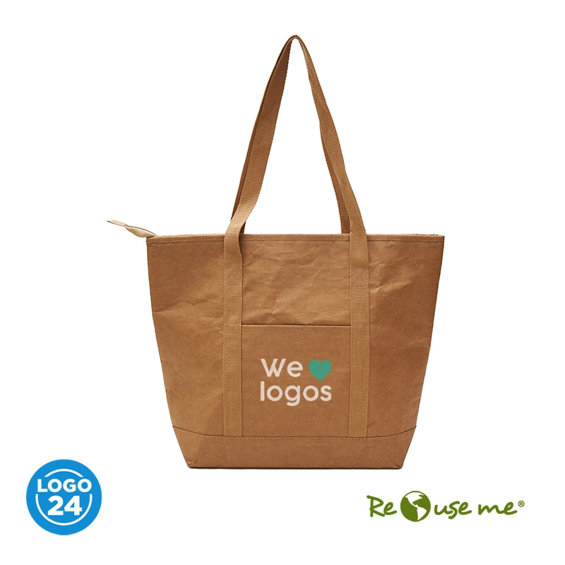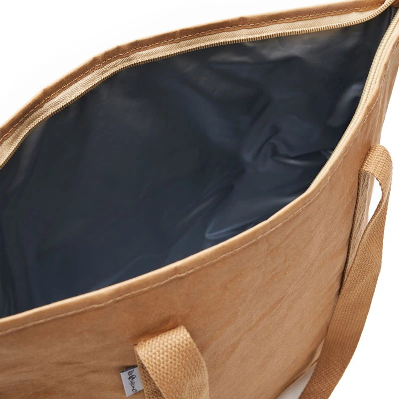 Cooler con formato tipo cartera. Realizado en papel kraft, con interior termico de PEVA. Medidas: 30,5 x 12 x 34 cm. Capacidad: 12L. Reuseme.