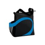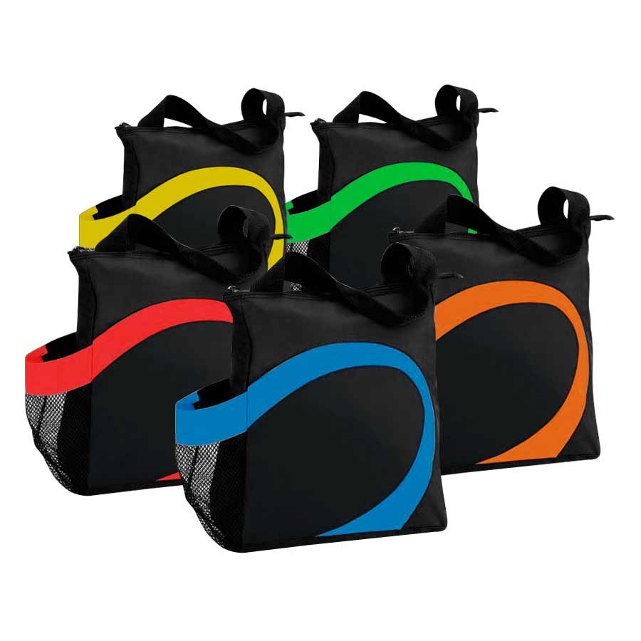 Cooler modelo «Wave». Tela exterior Polyester 70D/PVC. Tela interior plateada aislante 15C PEVA + relleno 3mm esponja PE. Cierre cremallera superior. Incluye bolsillo lateral en tela malla.