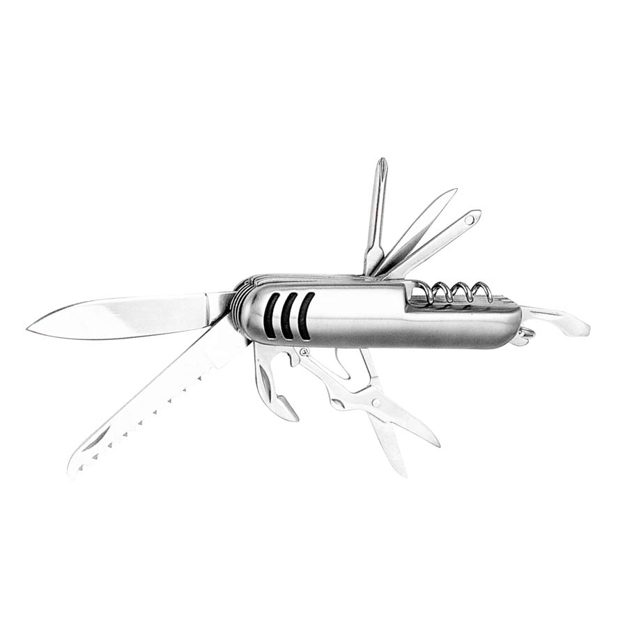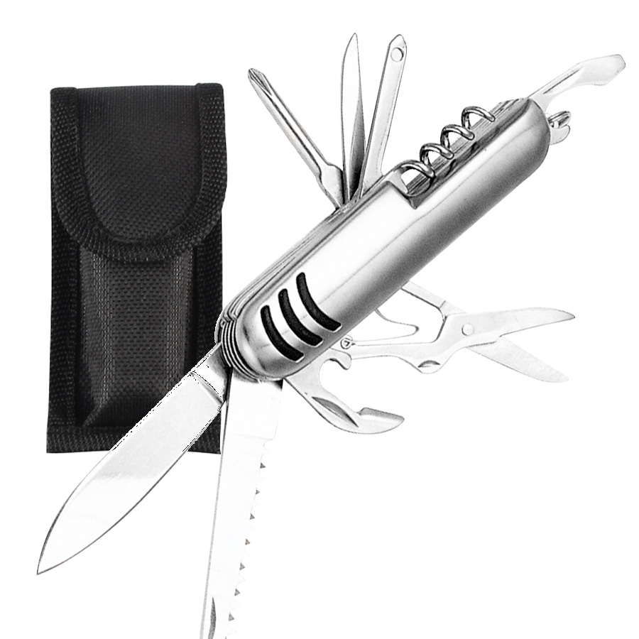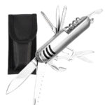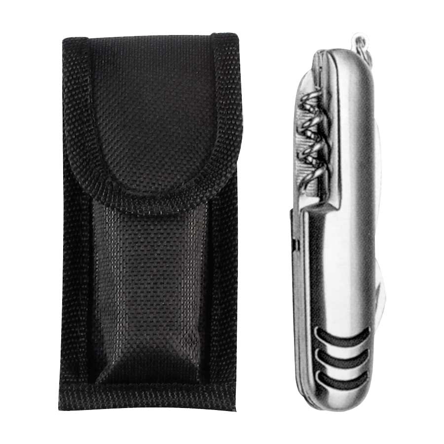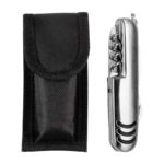 Cortaplumas de Acero Inoxidable con 10 funciones. Incluye funda de tela negra + caja de regalo plateada.