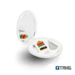 Mini costurero de viaje de plástico Incluye: Espejo, aguja con 4 tonos de hilo, botón y alfiler de gancho. Medidas: 5,5 x 8 cm.