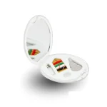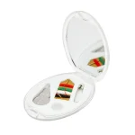Mini costurero de viaje de plástico Incluye: Espejo, aguja con 4 tonos de hilo, botón y alfiler de gancho. Medidas: 5,5 x 8 cm.