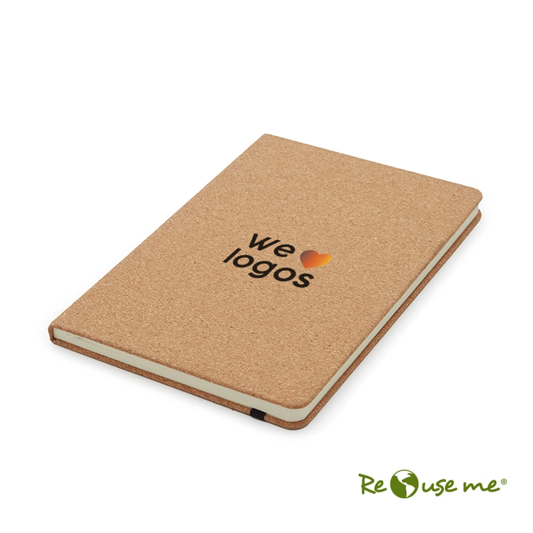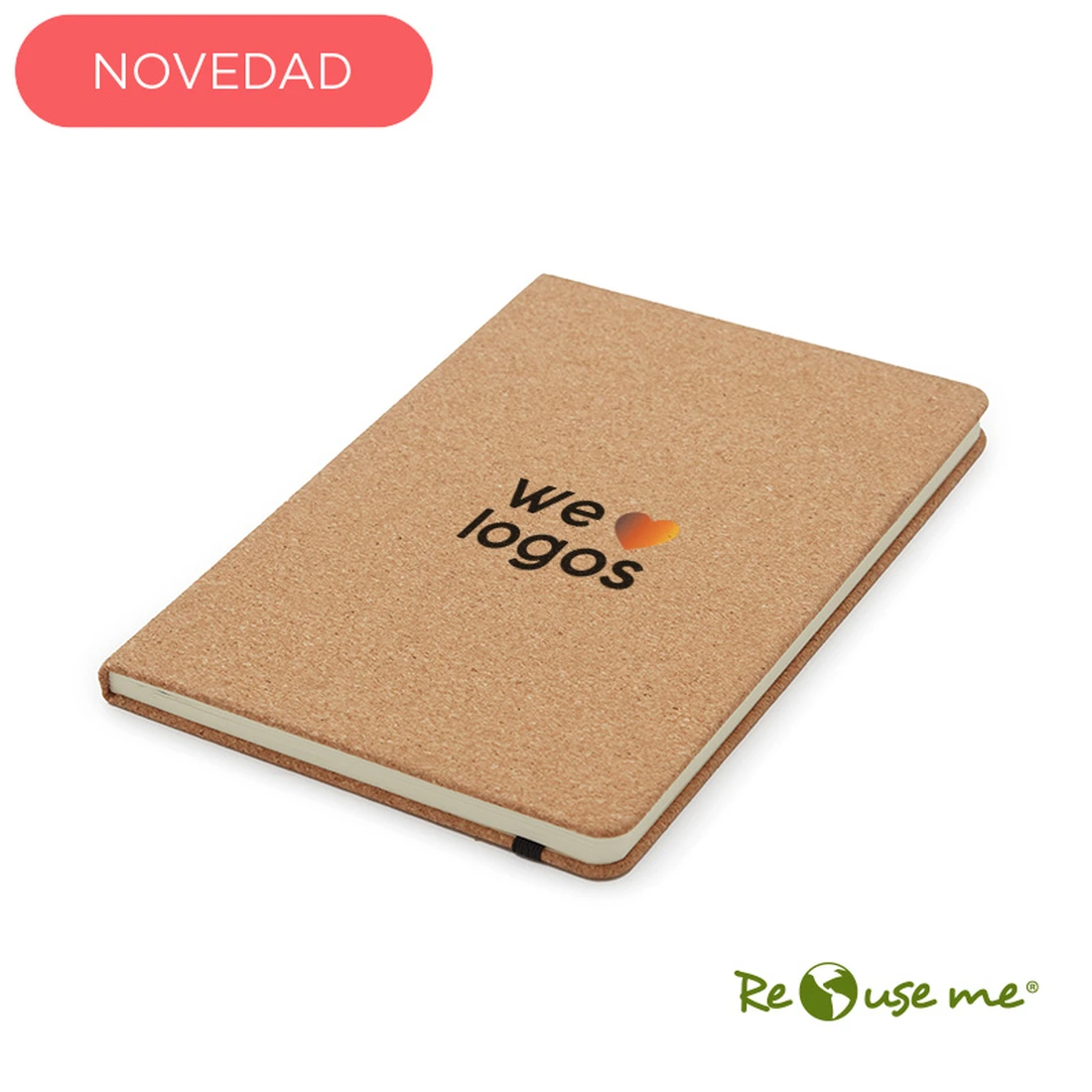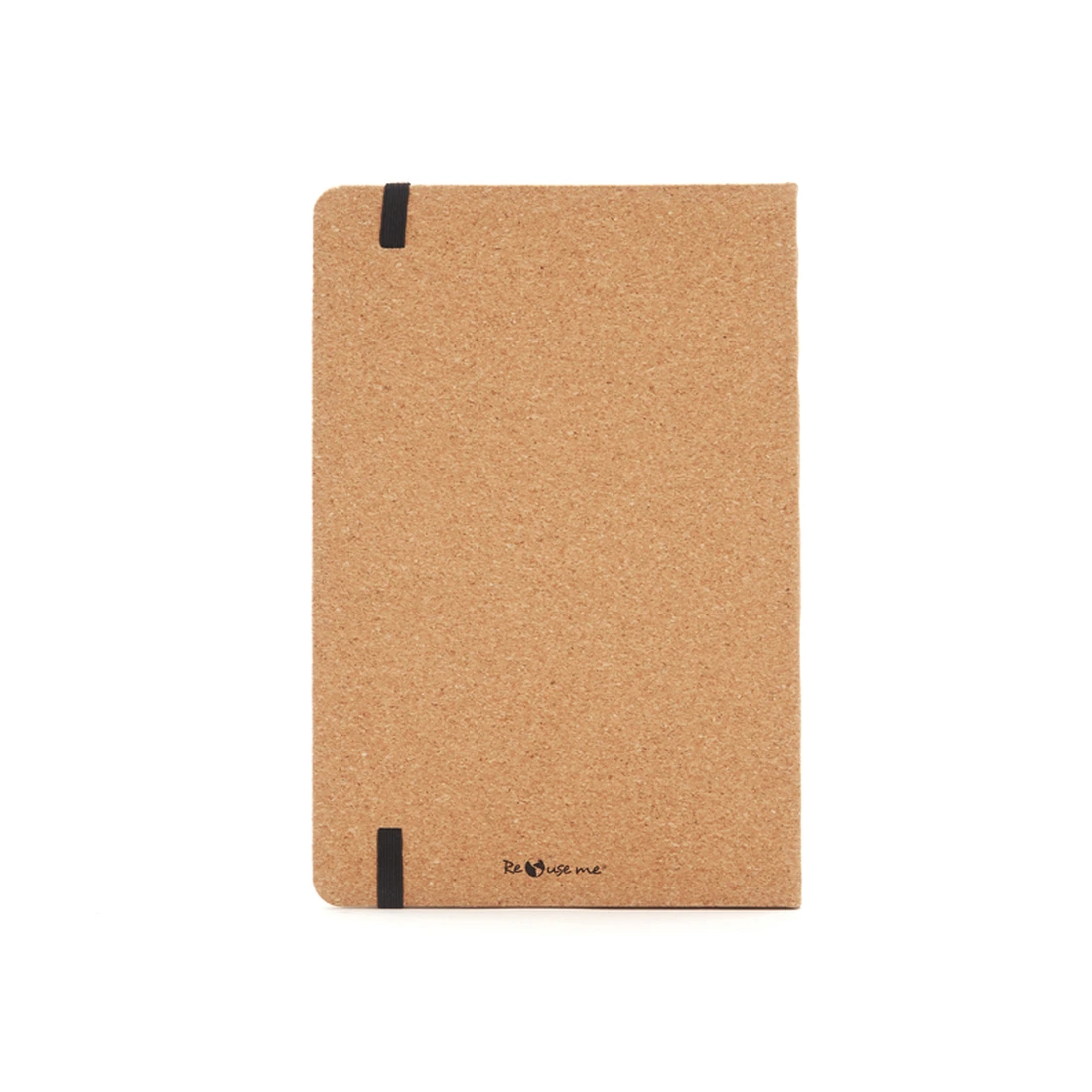 Cuaderno fabricado con cobertura de corcho. Hojas internas de 70 gramos en formato rayado, con 80 hojas en total. El producto se presenta en una bolsa de PLA 100% compostable. Dimensiones: 14 x 21 cm. Reuseme.