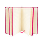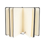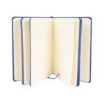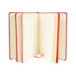 Cuaderno tamaño A5, con cubierta de PU eco-cuero de 2mm de espesor y lomo pintado de color al tono. Interior 80 hojas lineadas amarillas de 80gsm. Incluye banda separador de hojas al tono. Presentación individual en bolsa de polipropileno.