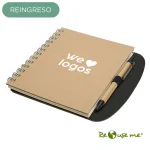 Cuaderno con 80 hojas lisas de 80 gramos y bolígrafo ecológico. Tapa dura realizada en cartón reciclado. Color cartón con detalles en negro. Medidas: 14,6 x 17,5 cm. Re use me