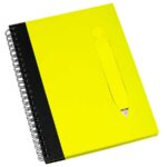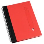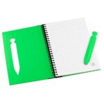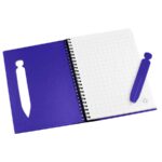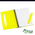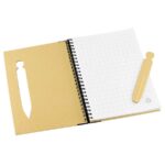 Cuaderno Ecológico con Tapas Duras de Color, en Cartón Reciclado 650gsm, 70 hojas interiores cuadriculadas y anillado metalico doble cero. Incluye Bolígrafo Ecológico de cartón troquelado, incrustado en la tapa.