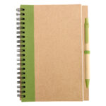 Cuaderno Ecológico grande (tamaño 1/2 oficio) con tapas de cartón reciclado y anillado doble cero, 50 hojas interiores blancas (croqueras). Incluye Bolígrafo ecológico.