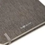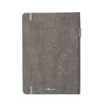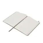 Cuaderno de tapa dura hecho de papel piedra y RPET fabricado con encuadernación tipo case. Está compuesto por una tapa de RPET con banda elástica de 6 mm, sujetador de bolígrafo elástico de 1,5 cm, esquinas redondeadas y logo grabado con hot stamp en la contratapa. Cuenta con cinta señaladora de 0,6 mm, hojas internas lisas sin impresión y opción de tapa en color negro o gris con detalles a tono. Es ideal para tomar notas, escribir ideas o usar como diario personal, tanto en entornos laborales como educativos o creativos.