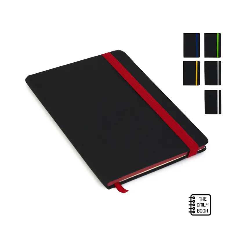 Cuaderno de tapa dura con 80 hojas rayadas A5 de 80gr Hecho en PVC con cierre elástico, cinta marcadora y borde de página en color. Encuadernación cosida. Medidas: 15 x 21 cm. The Daily Book.