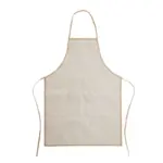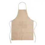 El delantal de ReUseMe está confeccionado en tela de Jute laminada con TNT, tela no tejida. Cuenta con dos tiras regulables para atar en la cintura y un bolsillo frontal.