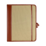 Deluxe Carpeta ejecutiva modelo «Windsor» en Eco-Cuero café y polyester café claro. Incluye bolsillo delantero. En el interior contiene Block de 20 hojas lineadas color beige, Bolsillo grande para documentos, Bolsillo con Cierre, Porta-Bolígrafo y Compartimentos para Tarjetas. Forrada en fina tela escocesa.