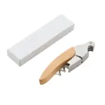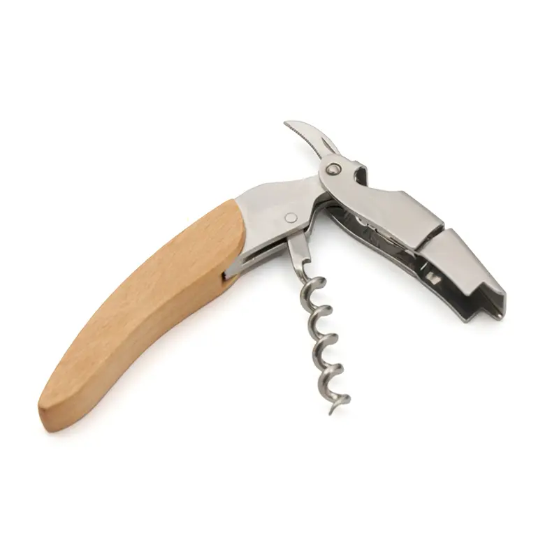 Destapador multiple con mango de madera. Fabricado en madera natural y acero inoxidable 420. Cuenta con sacacorchos de doble palanca, cuchilla retráctil y mango ergonómico de madera. Es ideal para abrir botellas de vino con facilidad, para uso en el hogar o en servicio profesional.