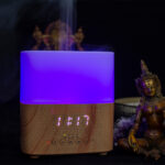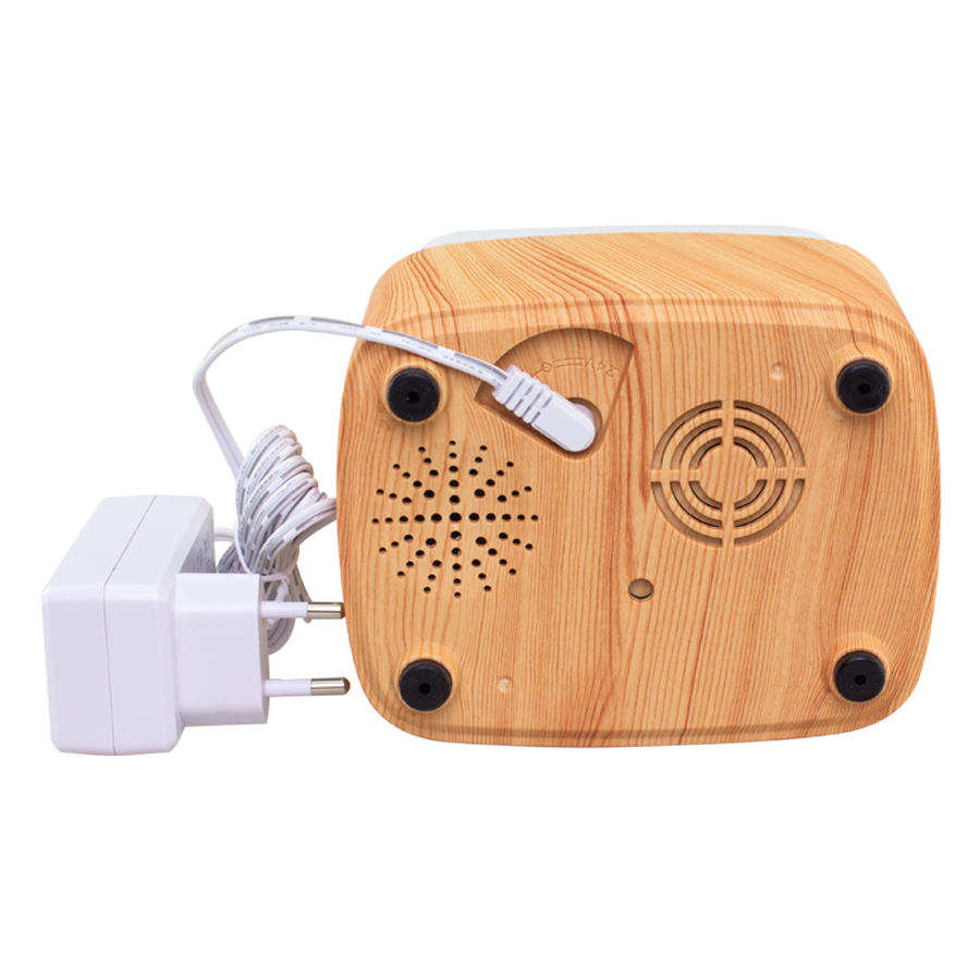 Difusor de Aroma con iluminación, reloj-alarma y parlantes. Contiene conexión Bluetooth para escuchar música desde el celular. Incluye juego de 7 luces LED rotativas de color, o bien se puede fijar cualquier color. Amplio contenido interno para líquido (hasta 300ml). Un producto para disfrutar y relajarse, que no puede faltar en tu hogar u oficina.