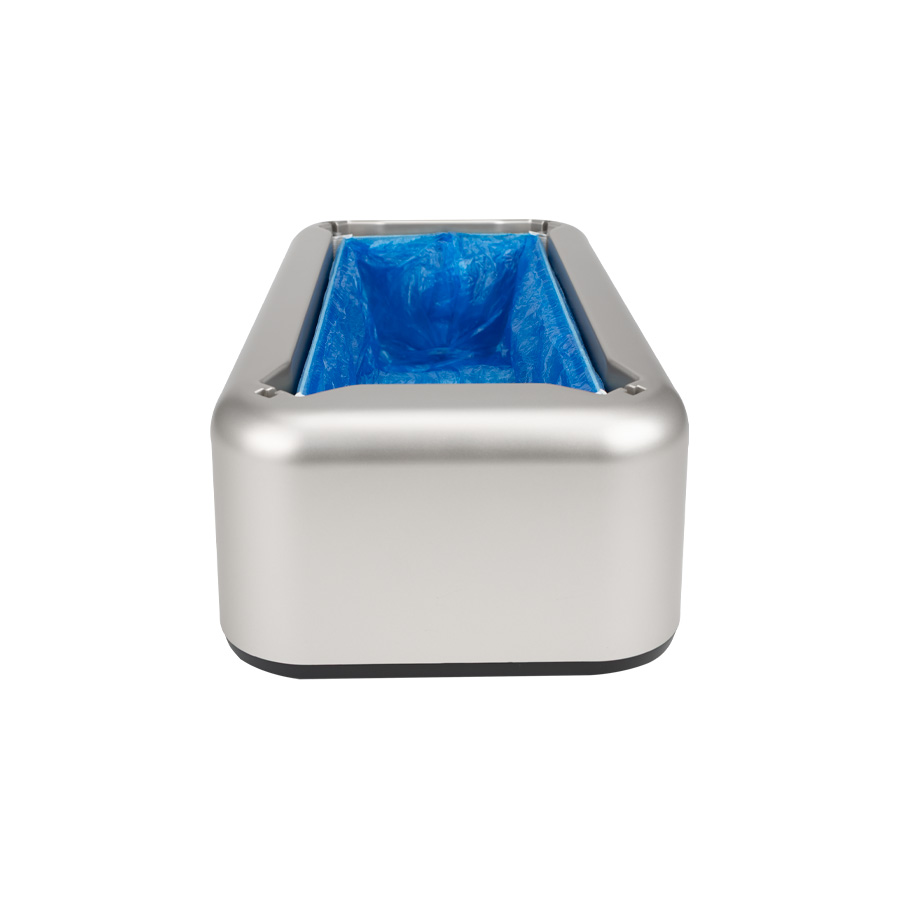 Dispensador de plástico ABS con estructura metálica, para Cubre-Calzado industrial. En cada pisada, entrega cobertor bolsa plástica de PE azul, ideal para mantener el calzado protegido de virus y bacterias en ambientes protegidos. Cada dispensador viene con 10 bolsas protectoras de calzado de PE (R18) de regalo, que se adhiere al calzado en forma automática en cada pisada dentro del dispensador.