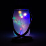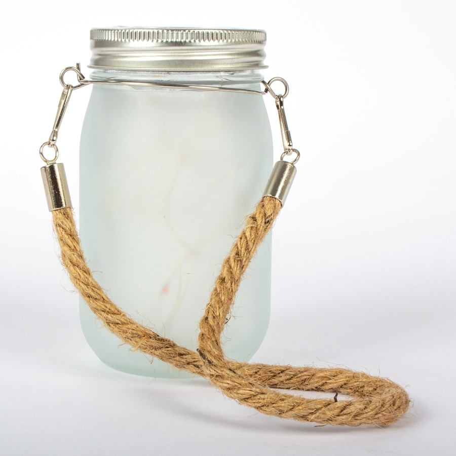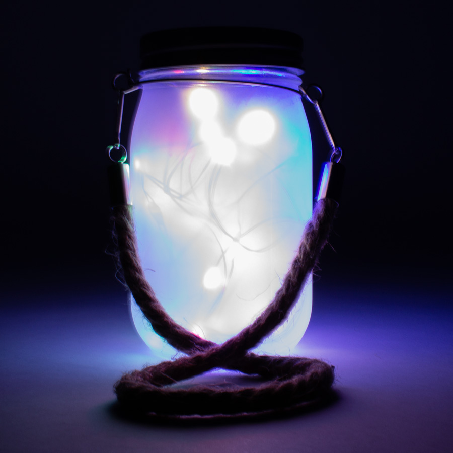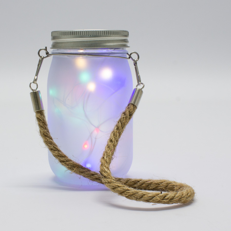 Farol para colgar, con forma de frasco y con tapa. Incluye cable con luces LED en el interior, que cambian de color. Sobre la tapa, contiene panel fotosensor, que permite que las luces LED se enciendan automáticamente cuando baja la luz-día. Las luces permanecerán encendidas por un lapso de 3 horas aproximadamente. IMPORTANTE: el panel fotosensor NO ES PANEL DE CARGA SOLAR, es decir, la carga de las luces LED viene dada por una pila AAA común (no incluída) y la función del panel fotosensor es encender las luces una vez que detecta una baja importante en la luz de día.