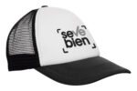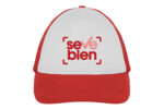 Ancho de base 18 cm. x alto 16 cm. Poliéster. Gorra trucker 5 gajos. Frente de color blanco. Parte trasera con tela red de color. Ajuste con broche plástico. Seis costuras 17,5 x 7,5 cm.