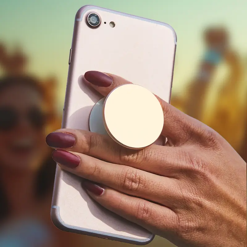 Holder POP UP plástico para celular compacto. Colores: Blanco o negro. Medidas: Diámetro 4 cm.