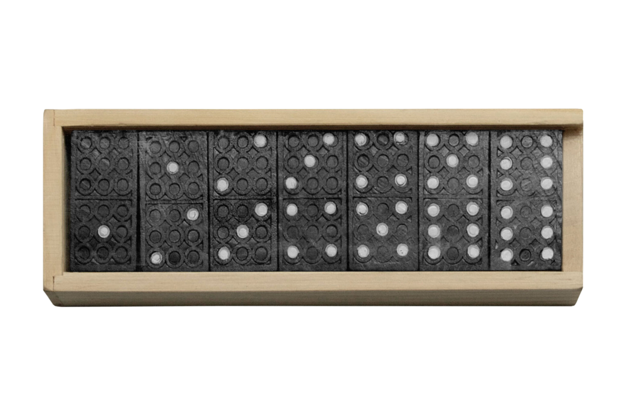 15 x 5 x 3 cm. Madera y plástico. Juego de dominó con 28 piezas de madera pintadas de negro, caja de madera y tapa plástica transparente. Manual de instrucciones dentro de la caja. Presentación en caja de regalo.