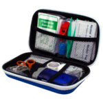 Kit de Primeros Auxilios en Estuche rígido de tela. Contiene 49 accesorios: 1 cabestrillo triangular, 1 linterna dínamo, 1 pito, 1 cinta adhesiva, 1 mascarilla, 4 toallitas húmedas antisépticas, 5 sobres con gaza estéril, 10 alfileres de gancho, 1 manta térmica plateada, 1 pinza, 1 multi-herramienta tarjeta metálica con funda, 1 banda PBT, 1 tijera, 10 toallitas húmedas con alcohol, 10 parche curitas.