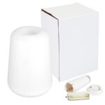 Lámpara de sobremesa de luz cálida amarilla, con luz LED removible. Usa 3 pilas AAA (no incluidas). Gran superficie de impresión. Presentación en caja de regalo de cartón blanco.