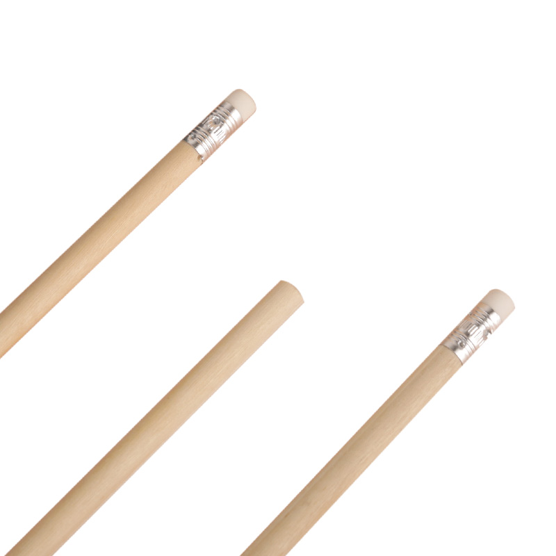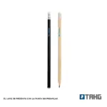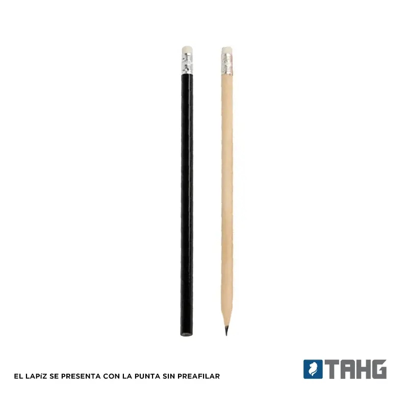 Lápiz grafito con goma. Realizado en madera con detalle de aluminio en reborde de goma. Material de la goma: Caucho. Punta sin preafilar. Medidas: 189 mm x Diámetro 0,8 mm. Mina: 2mm.