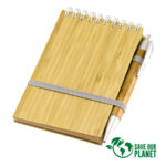 Libreta Ecológica con Tapas Duras de madera de Bamboo, 70 hojas interiores lineadas de papel kraft y anillado metalico doble cero. Incluye Bolígrafo Ecológico de madera de Bamboo con detalles plateados.