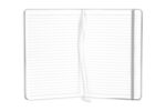 21 x 14 x 1,5 cm Cartón recubierto en poliuretano. 80 hojas rayadas.160 páginas.Separador de hojas en tela. Cierre con banda elástica. Bolsillo interior en la parte trasera de la libreta.