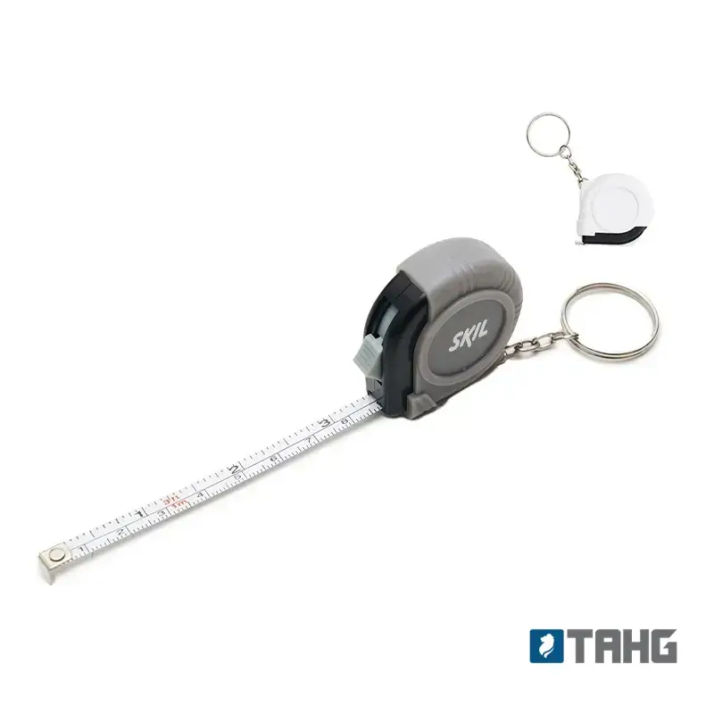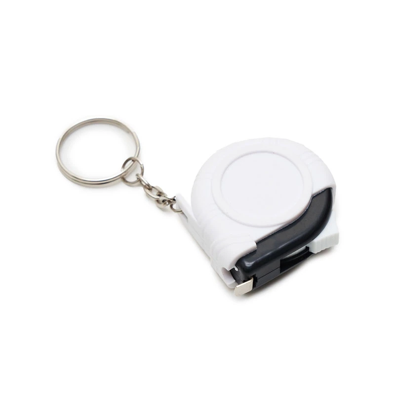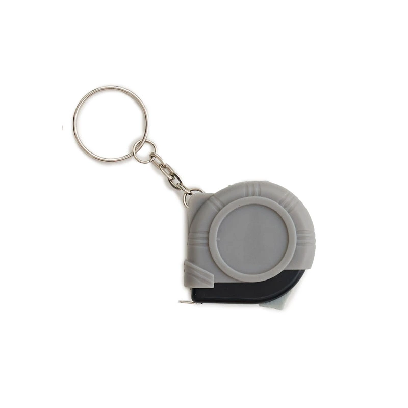 Llavero con cinta metrica retractil. Extensión: 1 metro. Medidas: 4,4 x 4,5 x 1,7 cm.