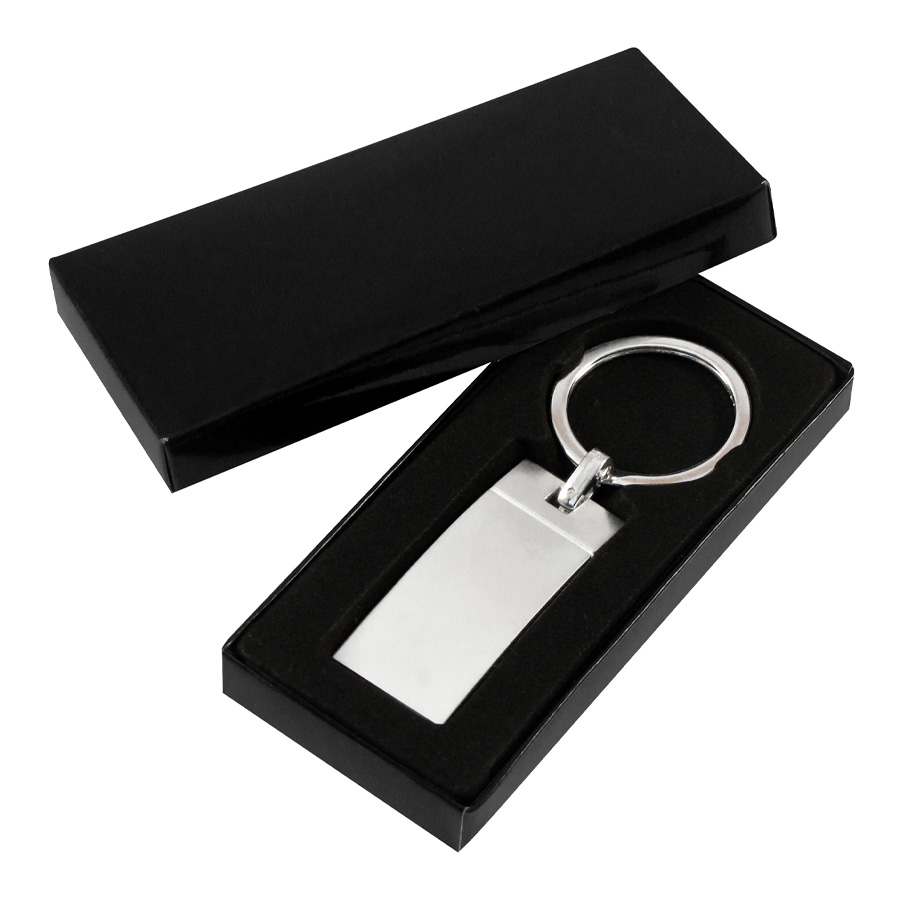 Llavero Metálico satinado, modelo «Wave». Presentación en estuche laminado negro con cuna aterciopelada.