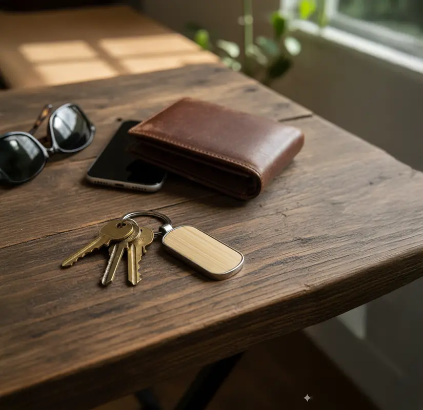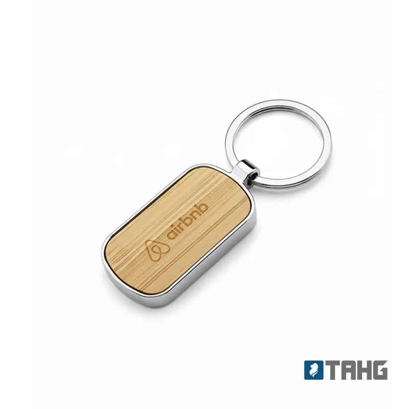 Llavero elegante de forma ovalada hecho de aleación de zinc y bambú natural fabricado con materiales duraderos y sostenibles. Cuenta con un diseño simple y moderno con anilla metálica para llaves es ideal para uso diario como accesorio ecológico o como regalo corporativo personalizado.