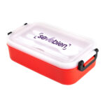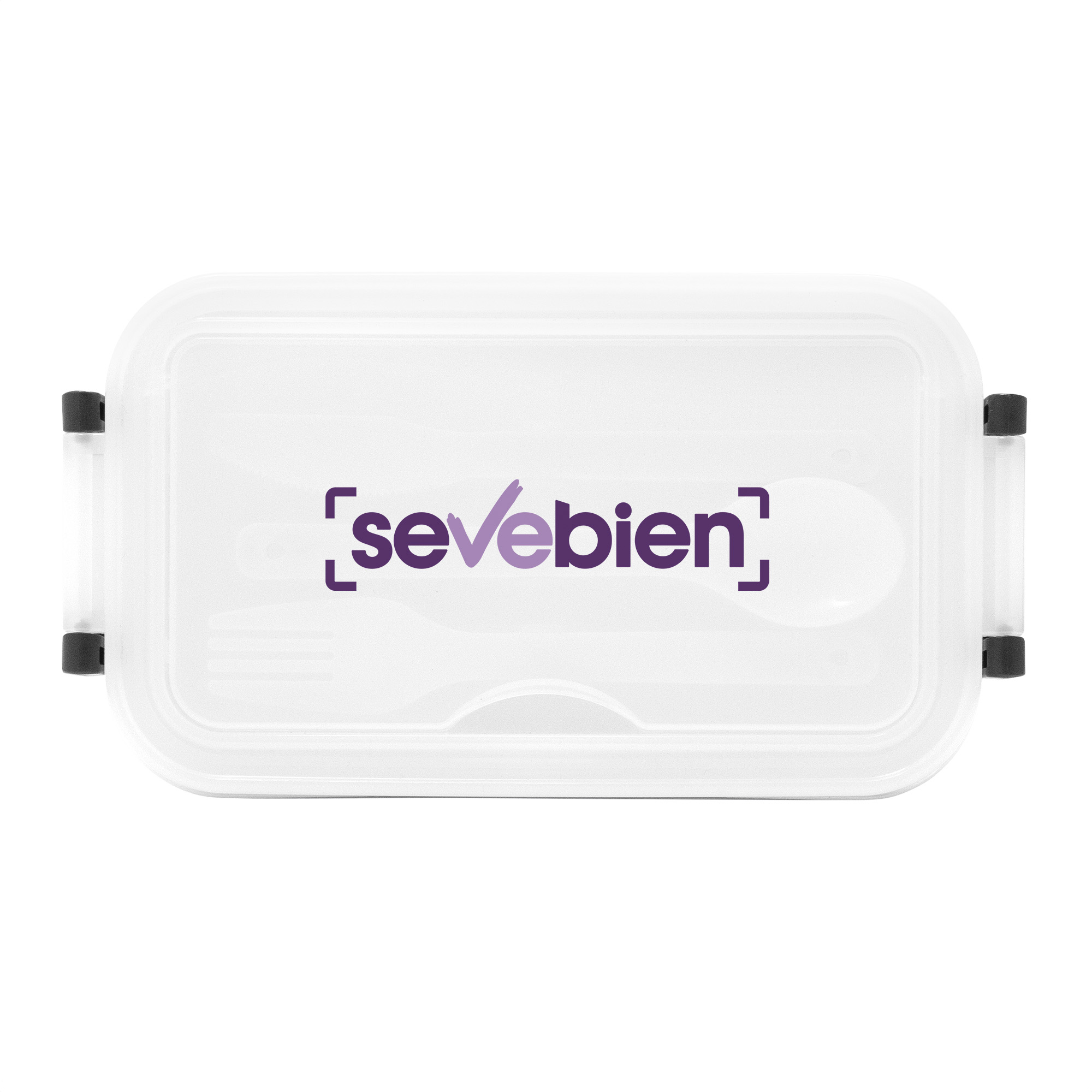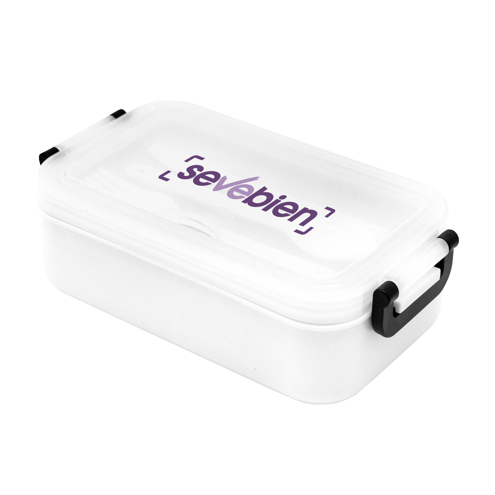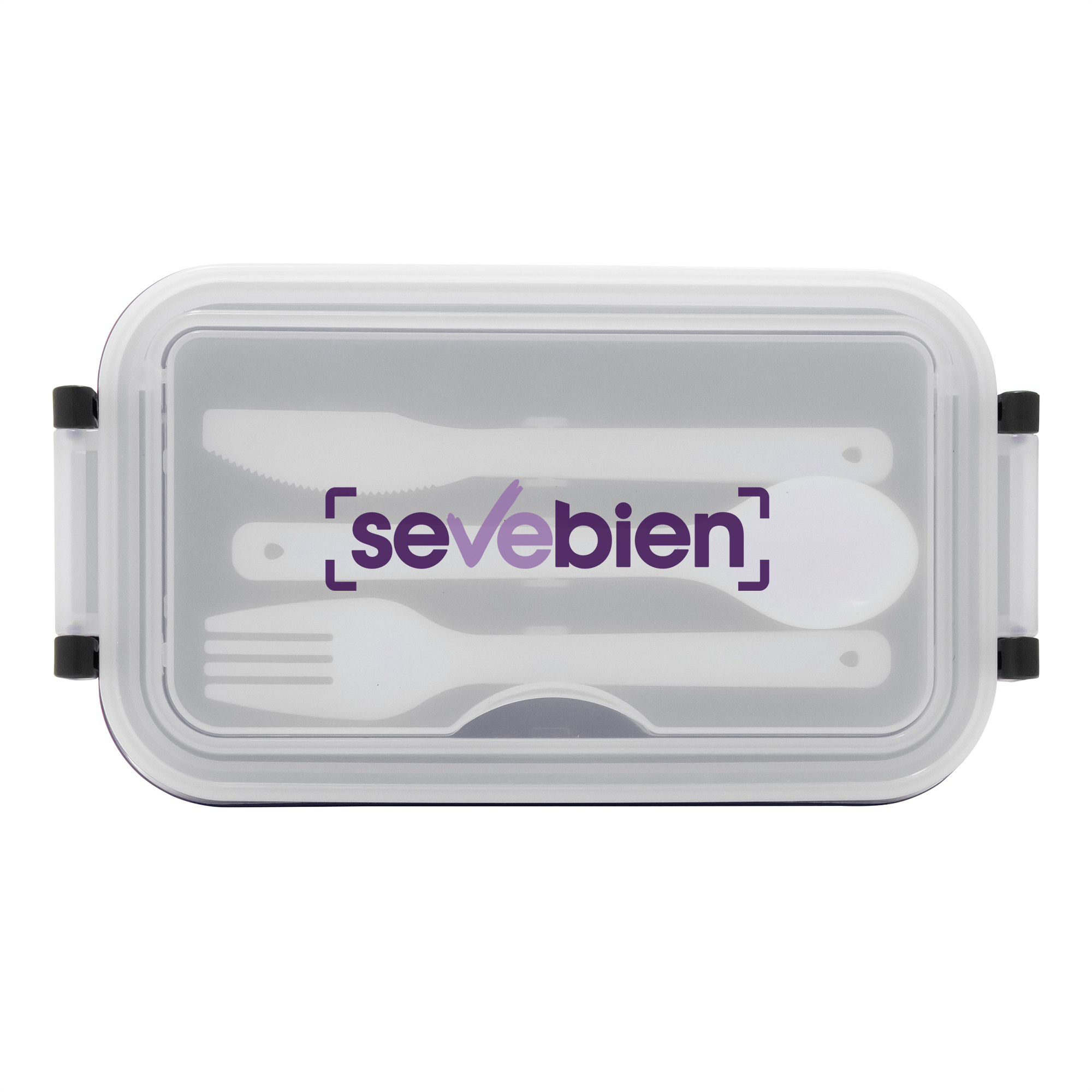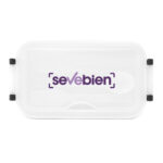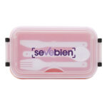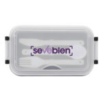 11,5 x 5,8 x 21,5 cm. Plástico Polipropileno. Contenedor de alimentos. Tapa translúcida con bandeja porta cubiertos, anillo de silicona antiderrame y ajustes de seguridad en sus laterales. Set de 3 cubiertos plásticos de color blanco (tenedor, cuchillo, cuchara) de 15 cm de largo.