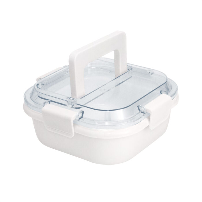 17,8 x 17,8 x 7,6 cm. Capacidad 1 litro. Plástico Polipropileno. Contenedor de alimentos. Tapa translúcida con cuatro clips de cierre hermético y asa para trasladar cómodamente. Clips y asa del mismo color que el recipiente.