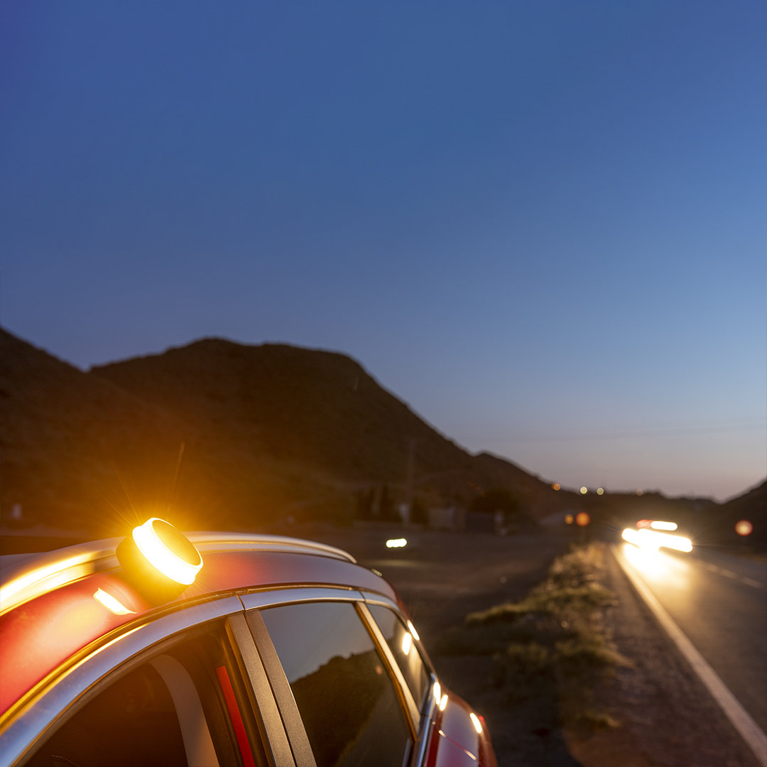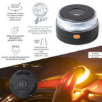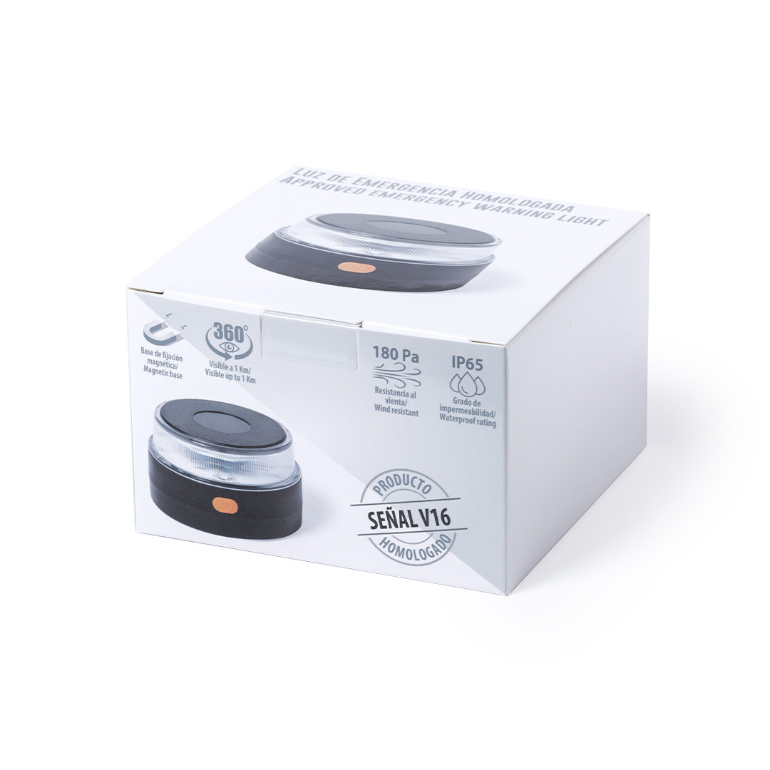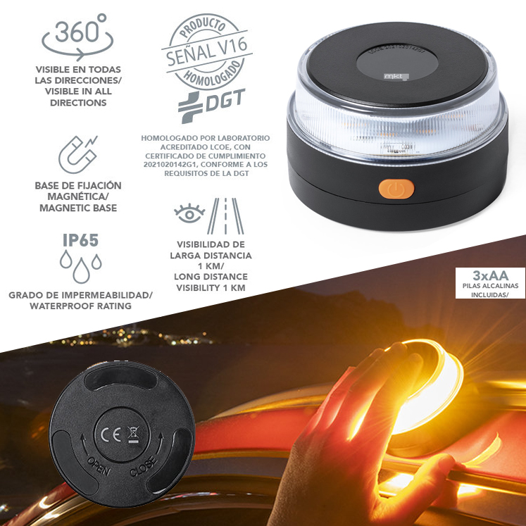 Luz de emergencia homologada V16 para vehículos. Fabricada conforme a la normativa de seguridad vigente y homologada por laboratorio acreditado LCOE, según requisitos de la DGT , con número de homologación marcado en la parte superior del artículo. De activación manual y con base de fijación magnética. Resistencia al viento de hasta 180Pa, visibilidad 360° -hasta 1 km de distancia- y resistencia al agua conforme a estándares IP65. De tamaño compacto para guardar en cualquier compartimento del vehículo y tenerla a mano en caso de emergencia. Presentada en caja individual de diseño. Manual incluido (español e inglés). Alimentación a pilas (3xAA pilas alcalinas incluidas). Banda lateral lisa para impresión. Certificado de Cumplimiento 2021020142G1 emitido por LCOE, conforme a los requisitos de la DGT. 9 Ledes. Magnética. 3 Pilas AA Incluidas