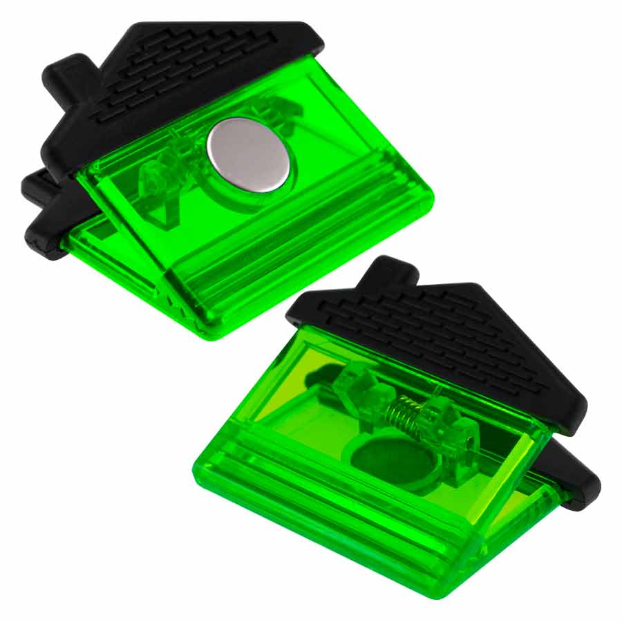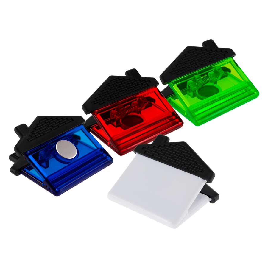 Magne-Clip Grande con forma de Casa y mango de goma negra. Amplia superficie para impresión de logo.