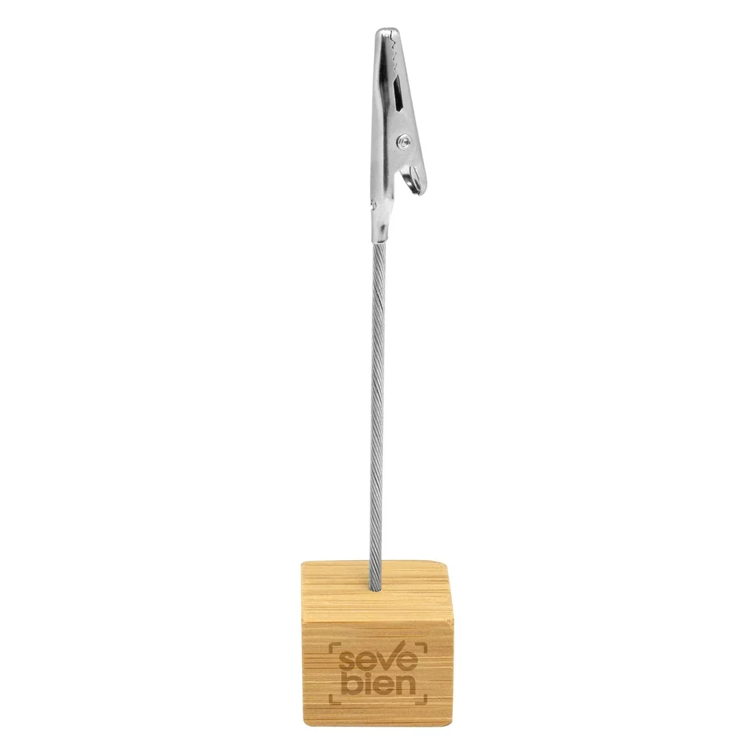 2,5 x 2,5 x 2,5 cm. Alto 11,5 cm Bambú. Memo clip de escritorio con base cúbica en bambú. Broche pinza cocodrilo de metal. Práctico, útil y transportable.
