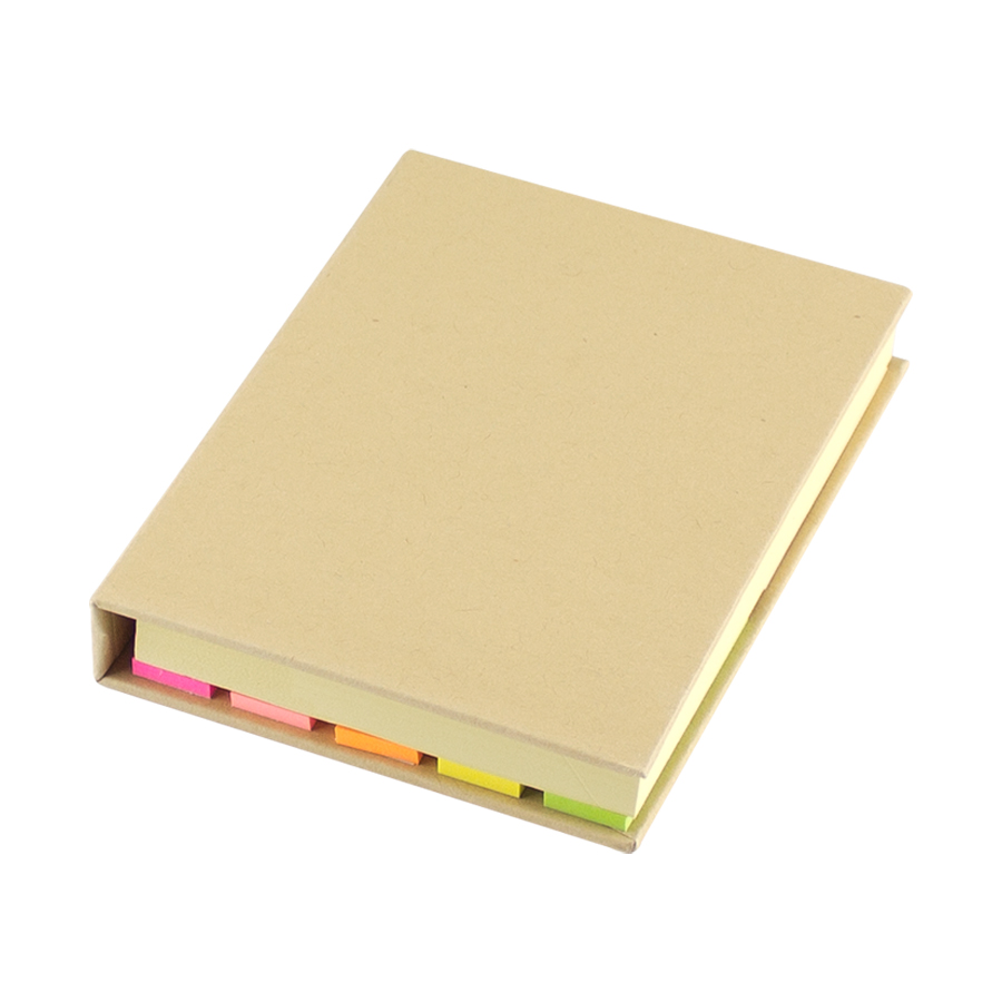 Memo set Ecológico con Tapa Dura de Cartón natural. Incluye 100 notas adhesivas amarillas grandes, 25 notas adhesivas amarillas medianas y 125 banderitas adhesivas de colores.