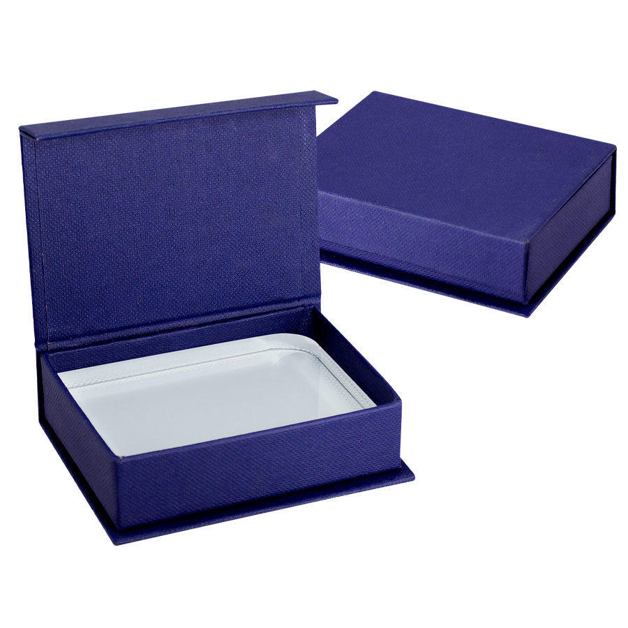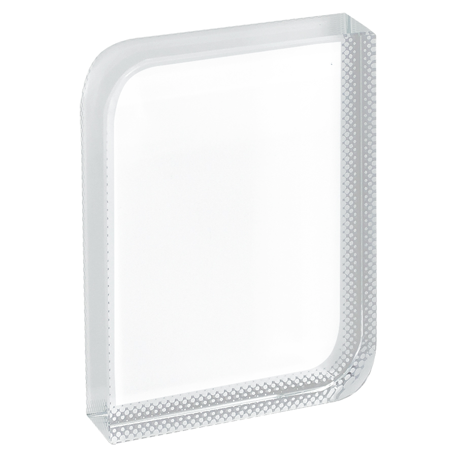 Mini-Trofeo rectangular de Cristal sólido para Sublimación, con 2 vértices redondeados. Presentación en caja de cartón azul.