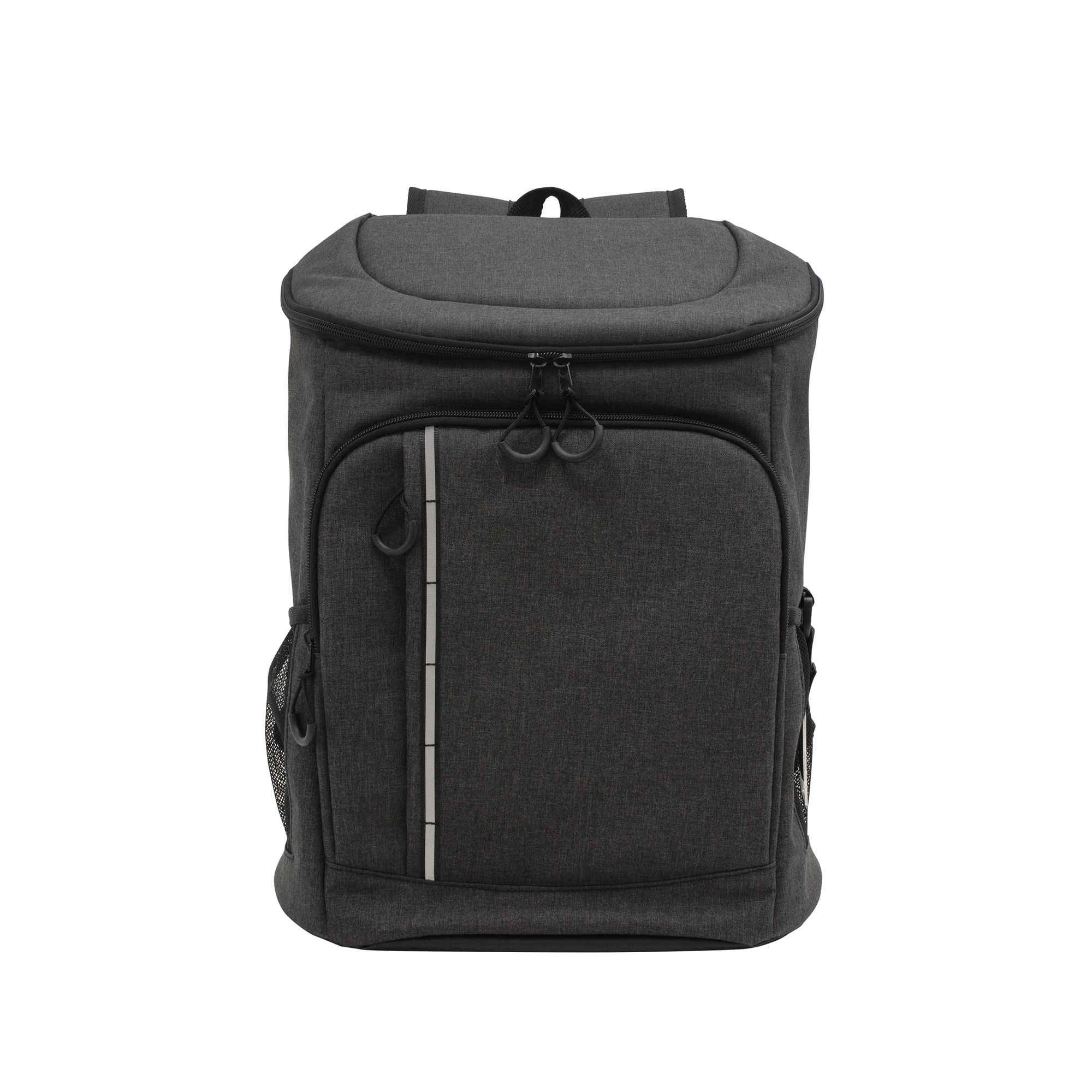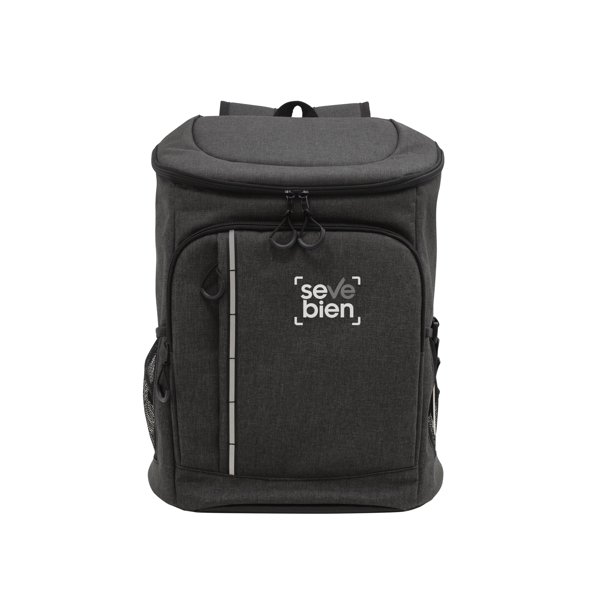 43 x 29 x 18 cm. Capacidad 18 litros aprox. Poliéster Wulong 300D + Interior forrado en PEVA color plata con relleno de espuma de PE. Mochila cooler. Compartimento principal con cierre en la parte superior. Compartimento frontal con cierre, bolsillo interno de red con cierre y bolsillo externo vertical con cierre y banda reflectante. Dos bolsillos laterales de red multipropósito. Incluye destapador de botellas de acero inoxidable (6,3 x 3,3 cm) extraíble. Correas regulables acolchadas. Cierres metálicos. Tiradores de cierre plásticos en forma de U de color negro.