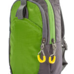 Mochila cruzada modelo «Crossback», en tela poliéster Stretch 210 Waterproof y poliéster «Ripstop». Incluye 2 compartimentos independientes + 1 bolsillo delantero + 1 bolsillo malla ajustable, gancho para colgar y hebilla de protección delantera. Reverso acolchado, con tela malla anti-transpiración para la espalda. Ideal para practicar deportes.