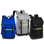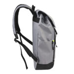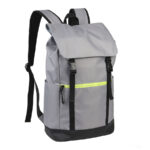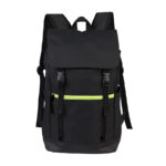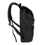 Mochila impermeable modelo «HARLEM». Fabricada en tela impermeable Poliéster Memory 75D + PU 210/D. Capacidad 19 litros, tamaño 29 x 46 x 14.5 cm. Incluye solapa y cierre delantero con cinta reflectante amarilla, bolsillo delantero. Interior acolchado.