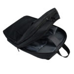 Mochila Porta-Notebook modelo «FORT». Fabricada en tela poliéster 600D/PVC. Capacidad 14 litros, tamaño 28 x 42 x 12 cm. Contiene 2 compartimentos interiores forrados en nylon, cuerpo completo: uno posterior (de seguridad) y otro central, ambos reforzados y acolchados, además de 2 compartimentos (bolsillo) delantero con cierre cremallera lateral. Espalda acolchada con red de ventilación.