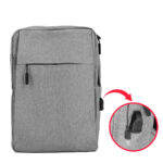 Mochila Porta-Notebook modelo «HOPE». En tela poliéster 300D/PVC denim. Capacidad 12 litros, tamaño 28 x 38.5 x 11 cm. Incluye compartimento principal con cremallera, reforzado y acolchado para Laptop, con cable interior y salida USB para carga exterior + segundo compartimento delantero reforzado y acolchado para i-pad o tablet, con cierre-eclair lateral + bolsillo delantero con cremallera. Espalda con correas acolchadas ajustables.