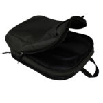 Mochila Porta-Notebook modelo «WALKER». Fabricada en tela poliéster 600D/PVC bitono, con detalles y tiradores en eco-cuero PU 210D. Capacidad 15 litros, tamaño 30 x 43 x 12 cm. Contiene 2 compartimentos interiores forrados en nylon, cuerpo completo: uno posterior (de seguridad) y otro central, ambos reforzados y acolchados para Laptop, además de 2 compartimentos (bolsillos) delanteros para aplicación de logo. En su parte posterior, contiene correa de PVC para anexar la mochila a carro de arrastre de maleta.