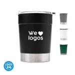 Mug térmico realizado en acero inoxidable en su exterior, y polipropileno de color negro en su interior, con tapa transparente cristal clear con cierre. Producto libre de BPA. Interior realizado en plástico. Medidas: 12 cm x Diámetro 8.5 cm. Capacidad: 360 ml. LOGO24: Producto disponible para el servicio de logueo en 24 horas respetando unidades mínimas de logueo y 200 unidades máximas. Consultar términos y condiciones del servicio