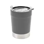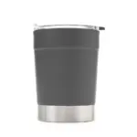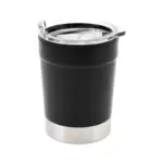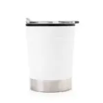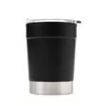 Mug térmico realizado en acero inoxidable en su exterior, y polipropileno de color negro en su interior, con tapa transparente cristal clear con cierre. Producto libre de BPA. Interior realizado en plástico.