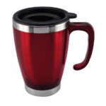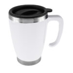 Mug térmico cónico de doble pared aislante con tapa pull-up de PVC negro y dosificador. Base interior de Acero Inoxidable y pared exterior de PVC.