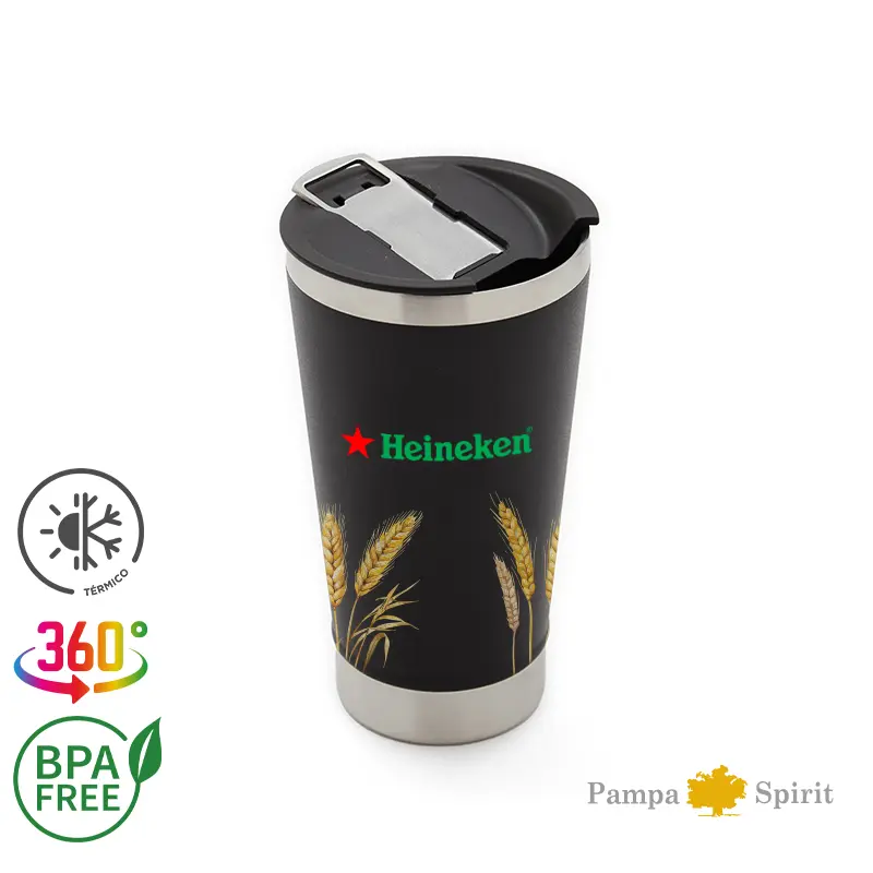 Mug de 600 ml fabricado en doble pared de acero inoxidable, diseñado para mantener la temperatura ideal, ya sea fría o caliente. Su tapa de PP incluye un destapador de botellas, combinando estilo y funcionalidad, perfecto para cualquier ocasión. El producto se presenta en una bolsa de PLA 100% compostable dentro de una caja de cartulina Kraft. Producto libre de BPA, aprobado por el I.N.A.L. para el contacto con alimentos.